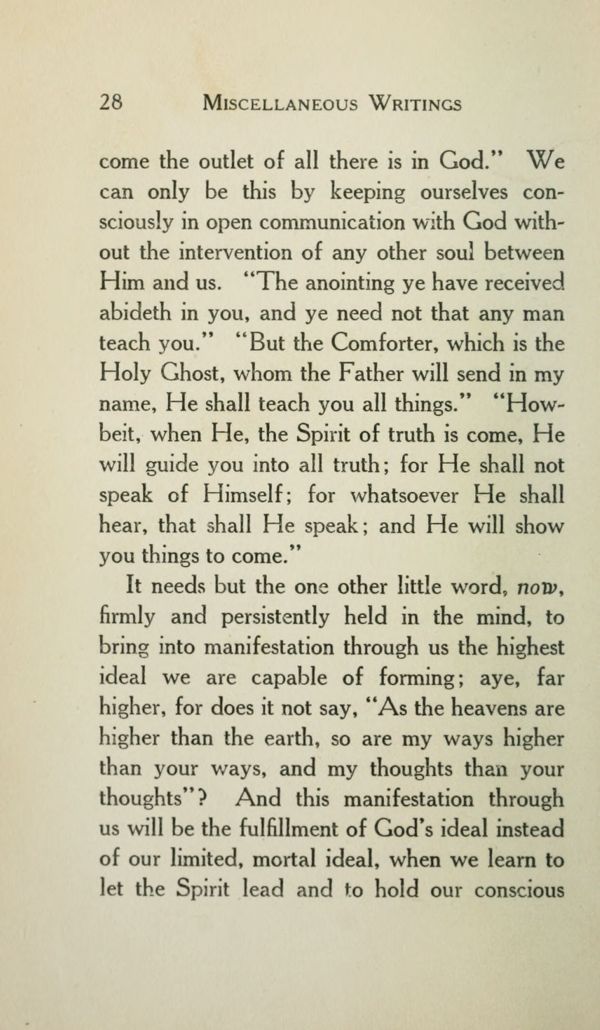 It needs but the one other little word, now, firmly and persistently held in the mind, to bring into manifestation through us the highest ideal we are capable of forming; aye, far higher, for does it not say, "As the heavens are higher than the earth, so are my ways higher than your ways, and my thoughts than your thoughts"? And this manifestation through us will be the fulfillment of God's ideal instead of our limited, mortal ideal, when we learn to let the Spirit lead and to hold our conscious