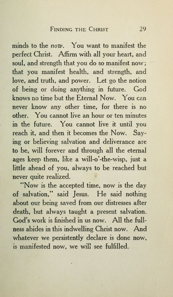 minds to the now. You want to manifest the perfect Christ. Affirm with all your heart, and soul, and strength that you do so manifest now; that you manifest health, and strength, and love, and truth, and power. Let go the notion of being or doing anything in future. God knows no time but the Eternal Now. You can never know any other time, for there is no other. You cannot live an hour or ten minutes in the future. You cannot live it until you reach it, and then it becomes the Now. Saying or believing salvation and deliverance are to be, will forever and through all the eternal ages keep them, like a will-o'-the-wisp, just a little ahead of you, always to be reached but never quite realized.