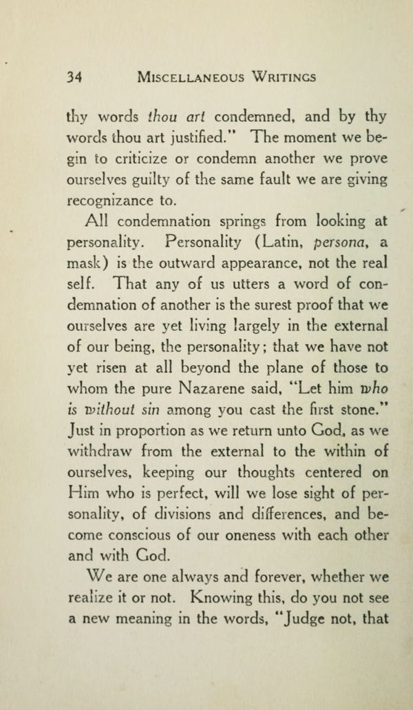 All condemnation springs from looking at personality. Personality (Latin, persona, a mask) is the outward appearance, not the real self. That any of us utters a word of condemnation of another is the surest proof that we ourselves are yet living largely in the external of our being, the personality that we have not yet risen at all beyond the plane of those to whom the pure Nazarene said, "Let him who is without sin among you cast the first stone." Just in proportion as we return unto God. as we withdraw from the external to the within of ourselves, keeping our thoughts centered on Him who is perfect, will we lose sight of personality, of divisions and differences, and become conscious of our oneness with each other and with God.