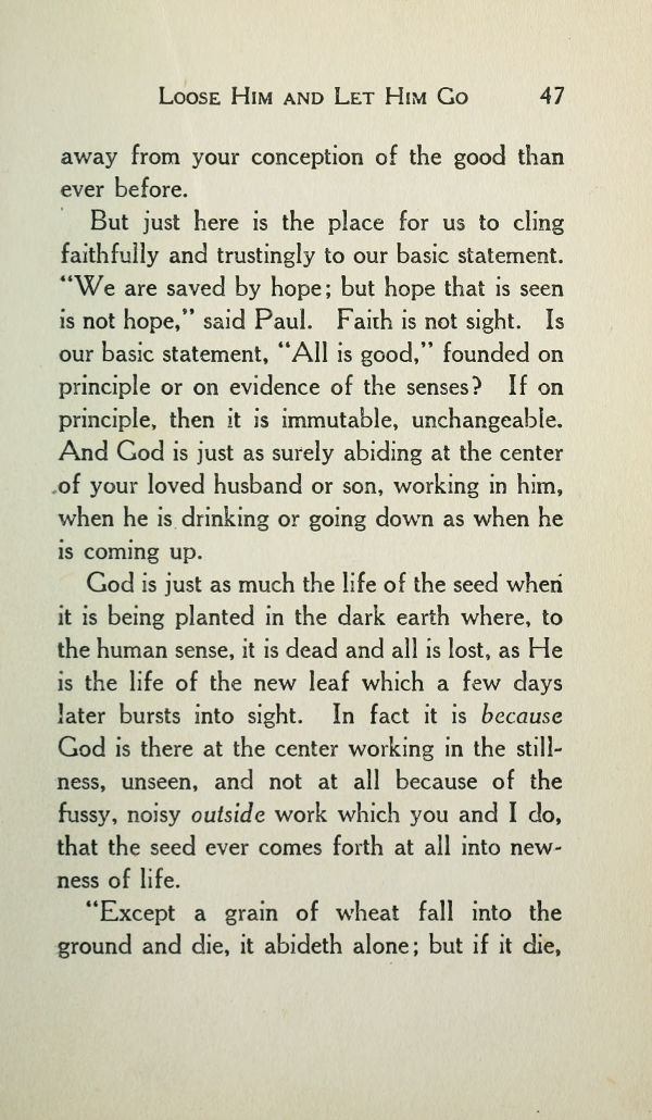 But just here is the place for us to cling faithfully and trustingly to our basic statement. "We are saved by hope; but hope that is seen is not hope," said Paul. Faith is not sight. Is our basic statement, "All is good," founded on principle or on evidence of the senses? If on principle, then it is immutable, unchangeable. And God is just as surely abiding at the center of your loved husband or son, working in him, when he is drinking or going down as when he is coming up.