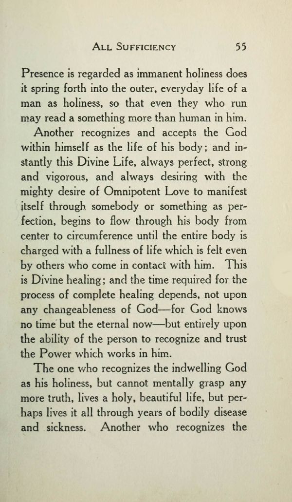 Another recognizes and accepts the God within himself as the life of his body; and instantly this Divine Life, always perfect, strong and vigorous, and always desiring with the mighty desire of Omnipotent Love to manifest itself through somebody or something as perfection, begins to flow through his body from center to circumference until the entire body is charged with a fullness of life which is felt even by others who come in contact with him. This is Divine healing; and the time required for the process of complete healing depends, not upon any changeableness of God --- for God knows no time but the eternal now --- hut entirely upon the ability of the person to recognize and trust the Power which works in him.