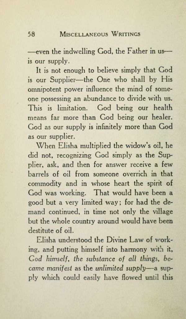 Elisha understood the Divine Law of working, and putting himself into harmony with it, God himself, the substance of all things, became manifest as the unlimited supply --- a supply which could easily have flowed until this