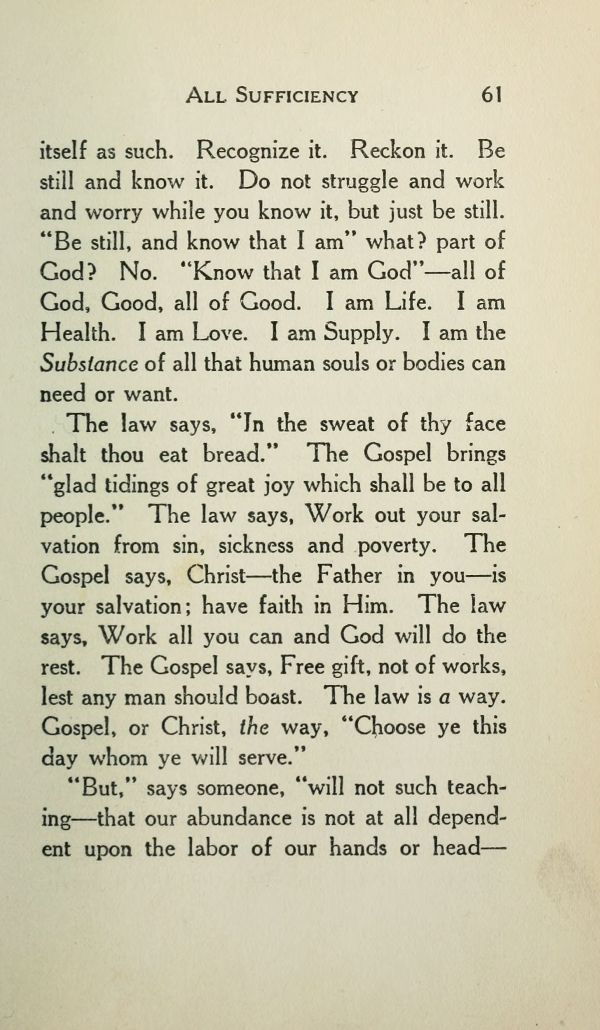 itself as such. Recognize it. Reckon it. Be still and know it. Do not struggle and work and worry while you know it, but just be still. "Be still, and know that I am" what? part of God? No. "Know that I am God" --- all of God, Good, all of Good. I am Life. I am Health. I am Love. I am Supply. I am the Substance of all that human souls or bodies can need or want.