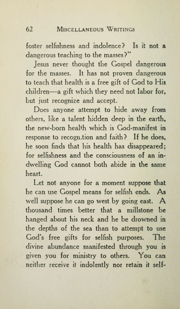 Does anyone attempt to hide away from others, like a talent hidden deep in the earth, the new-born health which is God-manifest in response to recognition and faith? If he does, he soon finds that his health has disappeared; for selfishness and the consciousness of an indwelling God cannot both abide in the same heart.