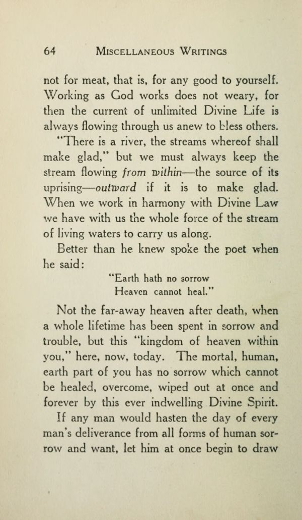 Not the far-away heaven after death, when a whole lifetime has been spent in sorrow and trouble, but this "kingdom of heaven within you," here, now, today. The mortal, human, earth part of you has no sorrow which cannot be healed, overcome, wiped out at once and forever by this ever indwelling Divine Spirit.