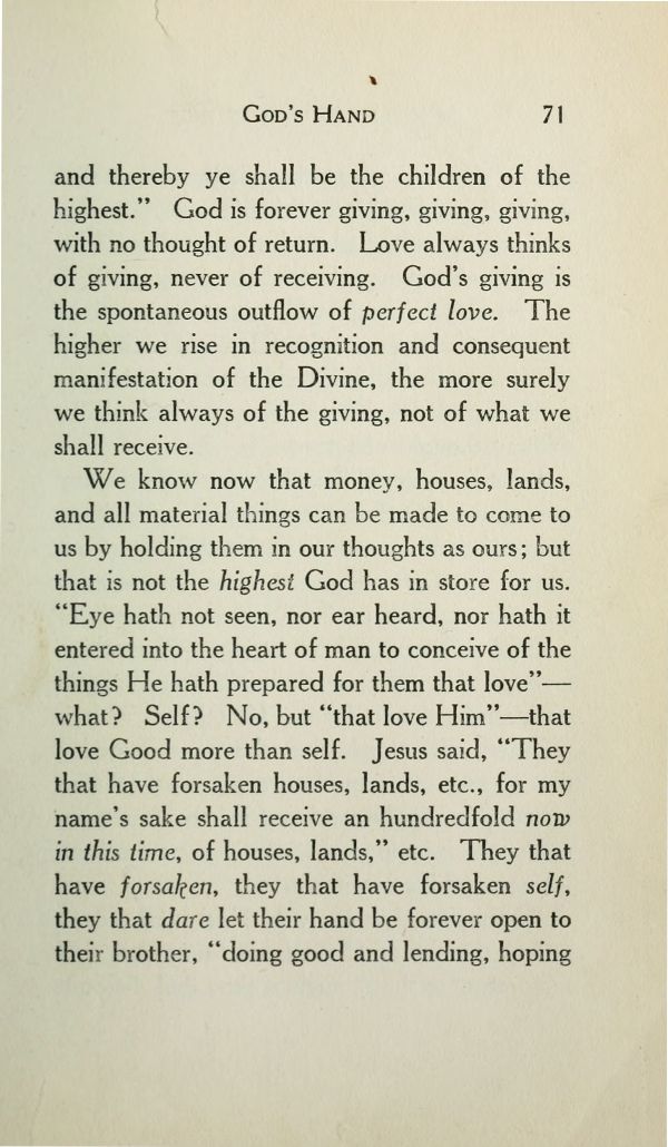We know now that money, houses, lands, and all material things can be made to come to us by holding them in our thoughts as ours; but that is not the highest God has in store for us. "Eye hath not seen, nor ear heard, nor hath it entered into the heart of man to conceive of the things He hath prepared for them that love" --- what? Self? No, but "that love Him" --- that love Good more than self. Jesus said, "They that have forsaken houses, lands, etc., for my name's sake shall receive an hundredfold now in this time, of houses, lands," etc. They that have forsaken, they that have forsaken self, they that dare let their hand be forever open to their brother, "doing good and lending, hoping