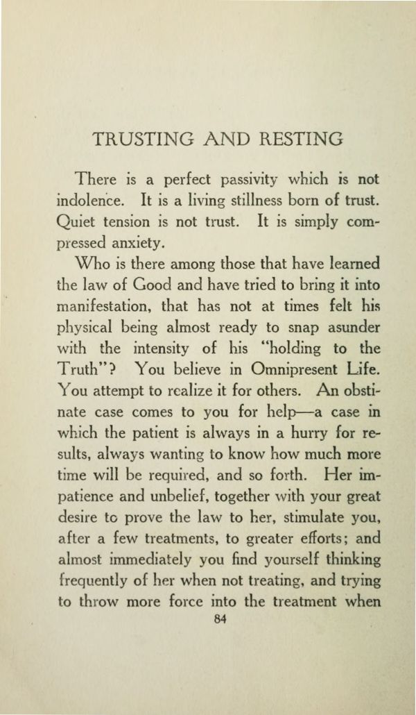 Who is there among those that have learned the law of Good and have tried to bring it into manifestation, that has not at times felt his physical being almost ready to snap asunder with the intensity of his "holding to the Truth"? You believe in Omnipresent Life. You attempt to realize it for others. An obstinate case comes to you for help --- a case in which the patient is always in a hurry for results, always wanting to know how much more time will be required, and so forth. Her impatience and unbelief, together with your great desire to prove the law to her, stimulate you, after a few treatments, to greater efforts; and almost immediately you find yourself thinking frequently of her when not treating, and trying to throw more force into the treatment when