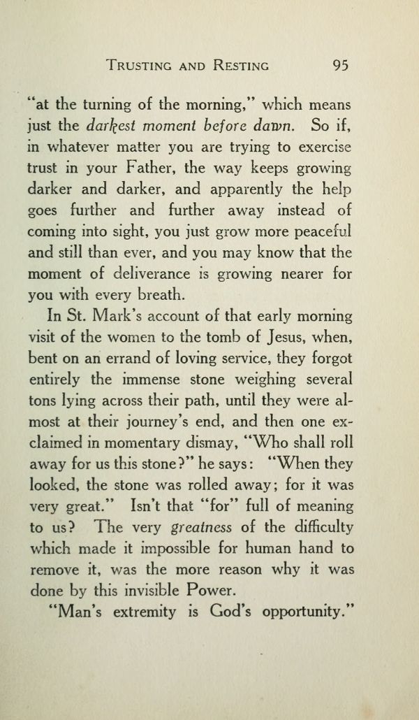 "at the turning of the morning," which means just the darkest moment before dawn. So if, in whatever matter you are trying to exercise trust in your Father, the way keeps growing darker and darker, and apparently the help goes further and further away instead of coming into sight, you just grow more peaceful and still than ever, and you may know that the moment of deliverance is growing nearer for you with every breath.