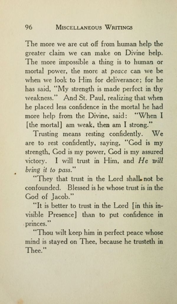 The more we are cut off from human help the greater claim we can make on Divine help. The more impossible a thing is to human or mortal power, the more at peace can we be when we look to Him for deliverance; for he has said, "My strength is made perfect in thy weakness." And St. Paul, realizing that when he placed less confidence in the mortal he had more help from the Divine, said: "When I [the mortal] am weak, then am I strong."