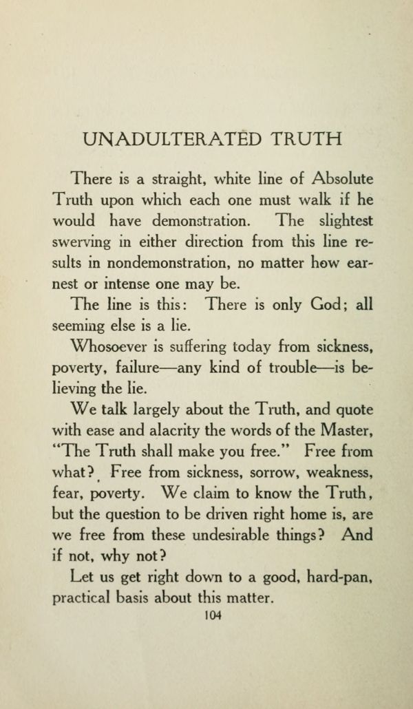 There is a straight, white line of Absolute Truth upon which each one must walk if he would have demonstration. The slightest swerving in either direction from this line results in nondemonstration, no matter how earnest or intense one may be.