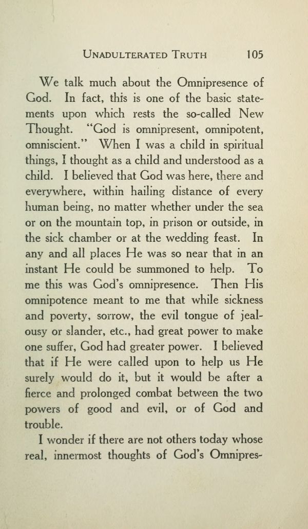 We talk much about the Omnipresence of God. In fact, this is one of the basic statements upon which rests the so-called New Thought. "God is omnipresent, omnipotent, omniscient." When I was a child in spiritual things, I thought as a child and understood as a child. I believed that God was here, there and everywhere, within hailing distance of every human being, no matter whether under the sea or on the mountain top, in prison or outside, in the sick chamber or at the wedding feast. In any and all places He was so near that in an instant He could be summoned to help. To me this was God's omnipresence. Then His omnipotence meant to me that while sickness and poverty, sorrow, the evil tongue of jealousy or slander, etc., had great power to make one suffer, God had greater power. I believed that if He were called upon to help us He surely would do it, but it would be after a fierce and prolonged combat between the two powers of good and evil, or of God and trouble.