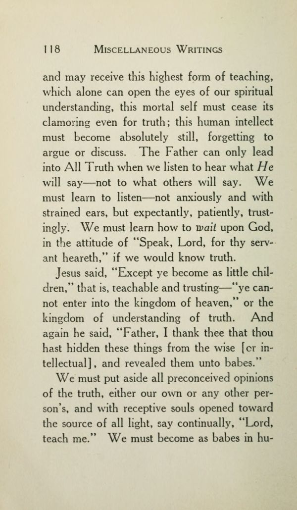 and may receive this highest form of teaching, which alone can open the eyes of our spiritual understanding, this mortal self must cease its clamoring even for truth; this human intellect must become absolutely still, forgetting to argue or discuss. The Father can only lead into All Truth when we listen to hear what He will say --- not to what others will say. We must learn to listen --- not anxiously and with strained ears, but expectantly, patiently, trustingly. We must learn how to wait upon God, in the attitude of "Speak, Lord, for thy servant heareth," if we would know truth.