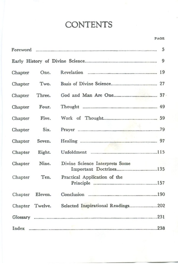 Contents - Foreword - Early History of Divine Science - Revelation - Basis of Divine Science - God and Man are One - Thought - The Work of Thought - Prayer - Healing - Unfoldment - Divine Science Interprets Some Important Doctrines - Practical Application of the Principle - Conclusion - Selected Inspirational Readings - Glossary - Index