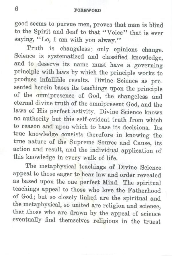 Truth is changeless; only opinions change. Science is systematized and classified knowledge, and to deserve its name must have a governing principle with laws by which the principle works to produce infallible results. Divine Science as presented herein bases its teachings upon the principle of the omnipresence of God, the changeless and eternal divine truth of the omnipresent God, and the laws of His perfect activity. Divine Science knows no authority but this self-evident truth from which to reason and upon which to base its decisions. Its true knowledge consists therefore in knowing the true nature of the Supreme Source and Cause, its action and result, and the individual application of this knowledge in every walk of life.
