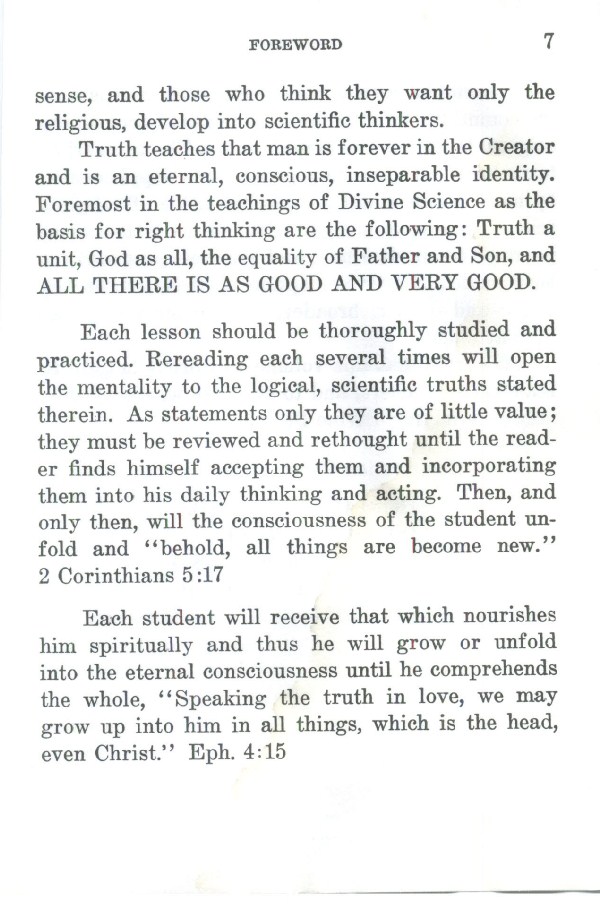 Each lesson should be thoroughly studied and practiced. Rereading each several times will open the mentality to the logical, scientific truths stated therein. As statements only they are of little value; they must be reviewed and rethought until the reader finds himself accepting them and incorporating them into his daily thinking and acting. Then, and only then, will the consciousness of the student unfold and "behold, all things are become new." 2 Corinthians 5:17