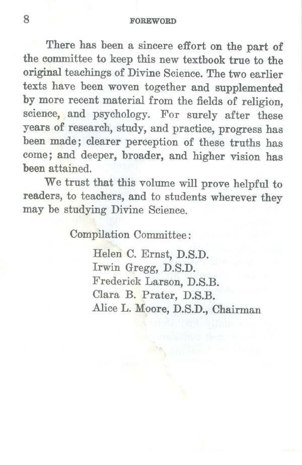 There has been a sincere effort on the part of the committee to keep this new textbook true to the original teachings of Divine Science. The two earlier texts have been woven together and supplemented by more recent material from the fields of religion, science, and psychology. For surely after these years of research, study, and practice, progress has been made; clearer perception of these truths has come; and deeper, broader, and higher vision has been attained.