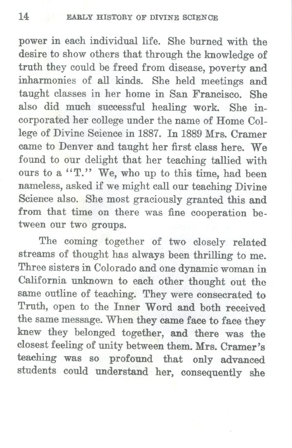 power in each individual life. She burned with the desire to show others that through the knowledge of truth they could be freed from disease, poverty and inharmonies of all kinds. She held meetings and taught classes in her home in San Francisco. She also did much successful healing work. She incorporated her college under the name of Home College of Divine Science in 1887. In 1889 Mrs. Cramer came to Denver and taught her first class here. We found to our delight that her teaching tallied with ours to a "T." We, who up to this time, had been nameless, asked if we might call our teaching Divine Science also. She most graciously granted this and from that time on there was fine cooperation between our two groups.