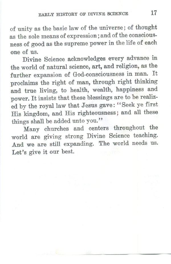 Many churches and centers throughout the world are giving strong Divine Science teaching. And we are still expanding. The world needs us. Let's give it our best.