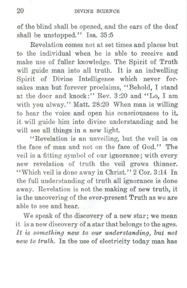 Revelation comes not at set times and places but to the individual when he is able to receive and make use of fuller knowledge. The Spirit of Truth will guide man into all truth. It is an indwelling Spirit of Divine Intelligence which never forsakes man but forever proclaims, "Behold, I stand at the door and knock:" Rev. 3:20 and "Lo, I am with you alway." Matt. 28:20 When man is willing to hear the voice and open his consciousness to it, it will guide him into divine understanding and he will see all things in a new light.