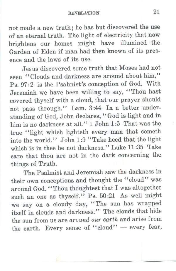 Jesus discovered some truth that Moses had not seen "Clouds and darkness are around about him," Ps. 97:2 is the Psalmist's conception of God. With Jeremiah we have been willing to say, "Thou hast covered thyself with a cloud, that our prayer should not pass through." Lam. 3:44 In a better understanding of God, John declares, "God is light and in him is no darkness at all." 1 John 1:5 That was the true "light which lighteth every man that cometh into the world." John 1:9 "Take heed that the light which is in thee be not darkness." Luke 11:35 Take care that thou are not in the dark concerning the things of Truth.