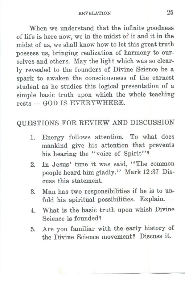 When we understand that the infinite goodness of life is here now, we in the midst of it and it in the midst of us, we shall know how to let this great truth possess us, bringing realization of harmony to ourselves and others. May the light which was so clearly revealed to the founders of Divine Science be a spark to awaken the consciousness of the earnest student as he studies this logical presentation of a simple basic truth upon which the whole teaching rests -- GOD IS EVERYWHERE.