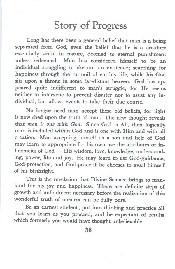 No longer need man accept these old beliefs, for light is now shed upon the truth of man. The new thought reveals that man is one with God. Since God is All, then logically man is included within God and is one with Him and with all creation. Man accepting himself as a son and heir of God may learn to appropriate for his own use the attributes or inherencics of God -- His wisdom, love, knowledge, understanding, power, life and joy. He may learn to use God-guidance, God-protection, and God-peace if he chooses to avail himself of his birthright.