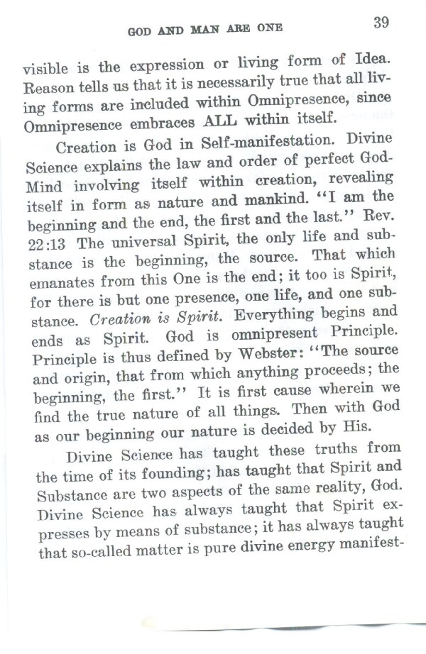 Creation is God in Self-manifestation. Divine Science explains the law and order of perfect God- Mind involving itself within creation, revealing itself in form as nature and mankind. "I am the beginning and the end, the first and the last." Rev. 22:13 The universal Spirit, the only life and substance is the beginning, the source. That which emanates from this One is the end; it too is Spirit, for there is but one presence, one life, and one substance. Creation is Spirit. Everything begins and ends as Spirit. God is omnipresent Principle. Principle is thus defined by Webster: "The source and origin, that from which anything proceeds; the beginning, the first" It is first cause wherein we find the true nature of all things. Then with God as our beginning our nature is decided by His.