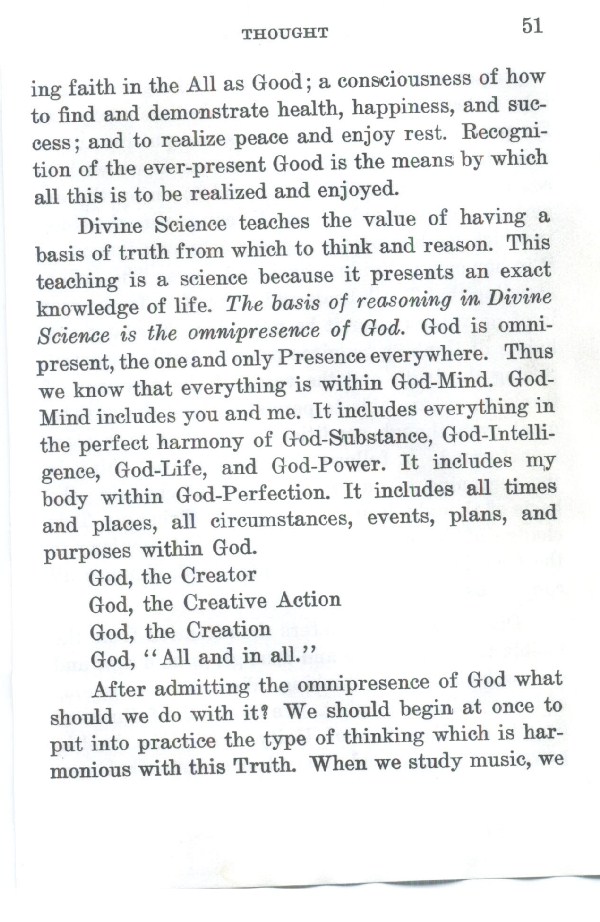 Divine Science teaches the value of having a basis of truth from which to think and reason. This teaching is a science because it presents an exact knowledge of life. The basis of reasoning in Divine Science is the omnipresence of God. God is omnipresent, the one and only Presence everywhere. Thus we know that everything is within God-Mind. GodMind includes you and me. It includes everything in the perfect harmony of God-Substance, God-Intelligence, God-Life, and God-Power. It includes my body within God-Perfection. It includes all times and places, all circumstances, events, plans, and purposes within God.