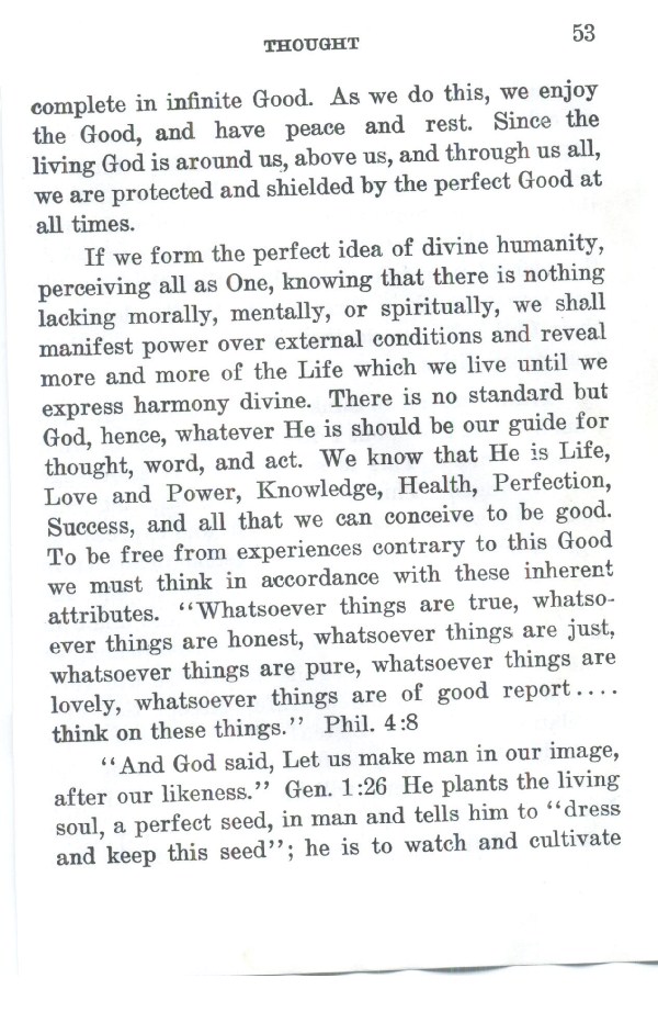 If we form the perfect idea of divine humanity, perceiving all as One, knowing that there is nothing lacking morally, mentally, or spiritually, we shall manifest power over external conditions and reveal more and more of the Life which we live until we express harmony divine. There is no standard but God, hence, whatever He is should be our guide for thought, word, and act. We know that He is Life, Love and Power, Knowledge, Health, Perfection, Success, and all that we can conceive to be good. To be free from experiences contrary to this Good we must think in accordance with these inherent attributes. "Whatsoever things are true, whatsoever things are honest, whatsoever things are just, whatsoever things are pure, whatsoever things are lovely, whatsoever things are of good report.... think on these things." Phil. 4:8