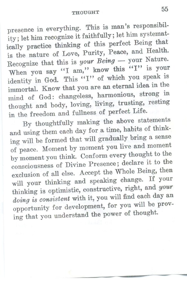 By thoughtfully making the above statements and using them each day for a time, habits of thinking will he formed that will gradually bring a sense of peace. Moment by moment you live and moment by moment you think. Conform every thought to the consciousness of Divine Presence; declare it to the exclusion of all else. Accept the Whole Being, then will your thinking and speaking change. If your thinking is optimistic, constructive, right, and your doing is consistent with it, you will find each day an opportunity for development, for you will be proving that you understand the power of thought.