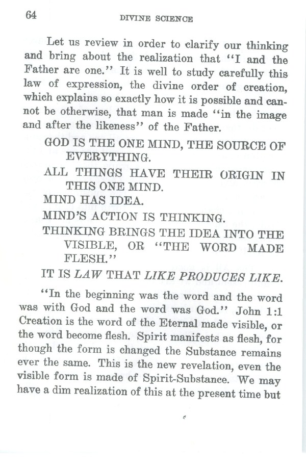 Contents - Foreword - Early History of Divine Science - Revelation - Basis of Divine Science - God and Man are One - Thought - The Work of Thought - Prayer - Healing - Unfoldment - Divine Science Interprets Some Important Doctrines - Practical Application of the Principle - Conclusion - Selected Inspirational Readings - Glossary - Index