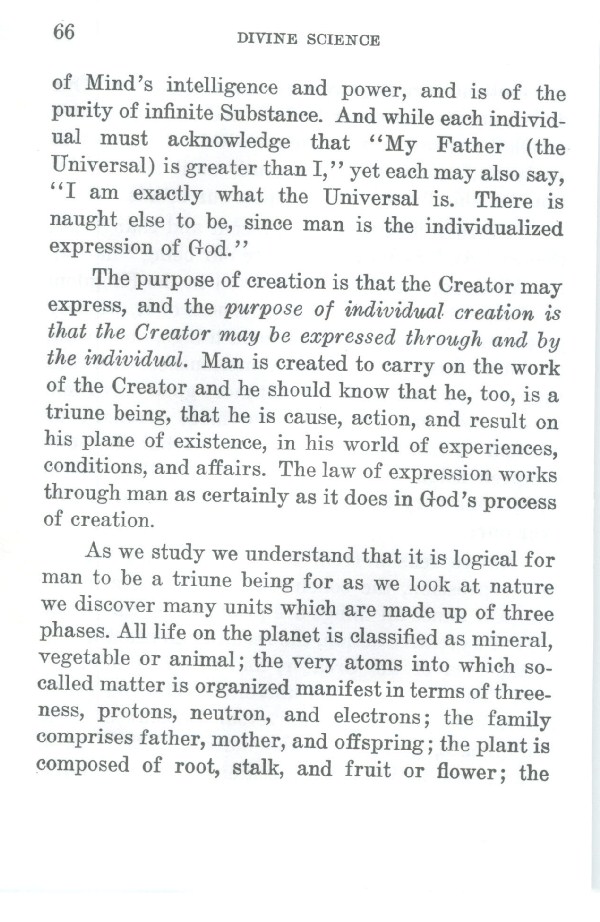 The purpose of creation is that the Creator may express, and the purpose of individual creation is that the Creator may be expressed through and by the individual. Man is created to carry on the work of the Creator and he should know that he, too, is a triune being, that he is cause, action, and result on his plane of existence, in his world of experiences, conditions, and affairs. The law of expression works through man as certainly as it does in God's process of creation.