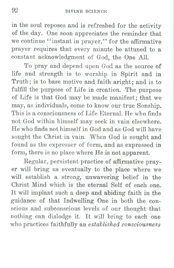 the soul reposes and is refreshed for the activity of the day. One soon appreciates the reminder that we continue "instant in prayer," for the affirmative prayer requires that every minute be attuned to a constant acknowledgment of God, the One All.