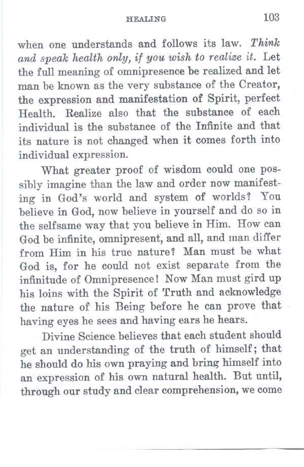 Divine Science believes that each student should get an understanding of the truth of himself; that he should do his own praying and bring himself into an expression of his own natural health. But until, through our study and clear comprehension, we come