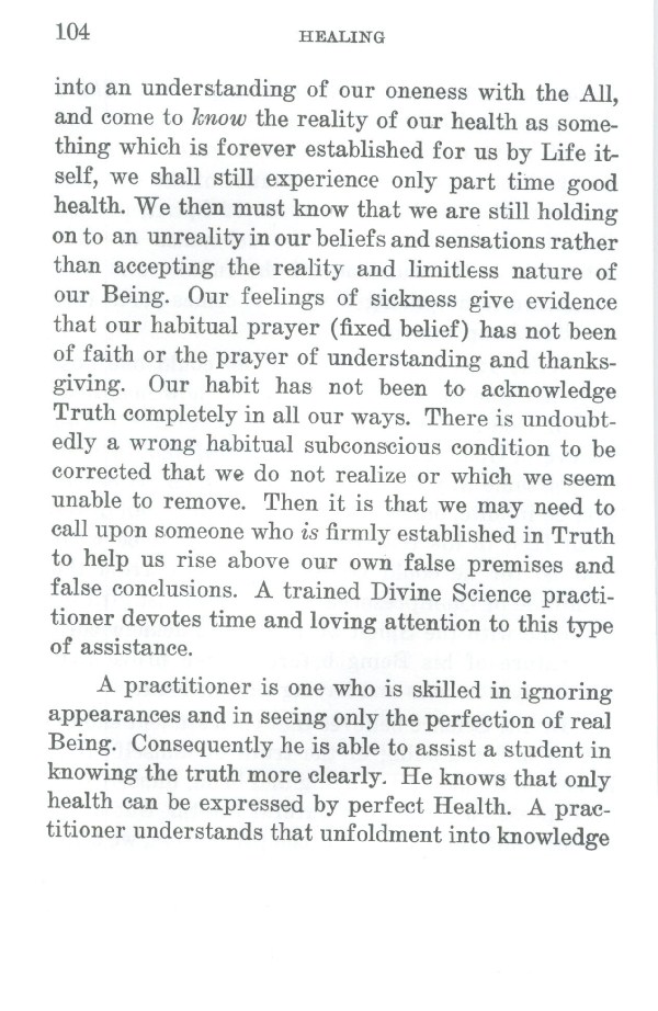 into an understanding of our oneness with the All, and come to know the reality of our health as something which is forever established for us by Life itself, we shall still experience only part time good health. We then must know that we are still holding on to an unreality in our beliefs and sensations rather than accepting the reality and limitless nature of our Being. Our feelings of sickness give evidence that our habitual prayer (fixed belief) has not been of faith or the prayer of understanding and thanksgiving. Our habit has not been to acknowledge Truth completely in all our ways. There is undoubtedly a wrong habitual subconscious condition to be corrected that we do not realize or which we seem unable to remove. Then it is that we may need to call upon someone who is firmly established in Truth to help us rise above our own false premises and false conclusions. A trained Divine Science practitioner devotes time and loving attention to this type of assistance.