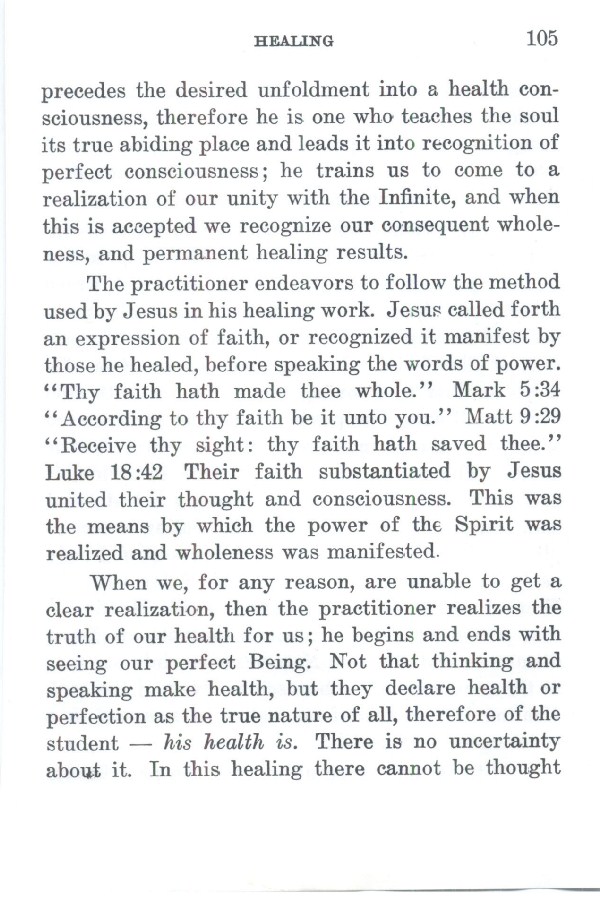 The practitioner endeavors to follow the method used by Jesus in his healing work. Jesus called forth an expression of faith, or recognized it manifest by those he healed, before speaking the words of power. "Thy faith hath made thee whole." Mark 5:34 "According to thy faith be it unto you." Matt 9:29 "Receive thy sight: thy faith hath saved thee." Luke 18:42 Their faith substantiated by Jesus united their thought and consciousness. This was the means by which the power of the Spirit was realized and wholeness was manifested.