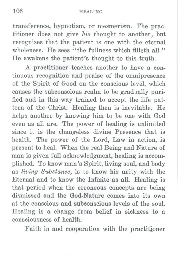 transference, hypnotism, or mesmerism. The practitioner does not give his thought to another, but recognizes that the patient is one with the eternal wholeness. He sees "the fullness which filleth all." He awakens the patient's thought to this truth.