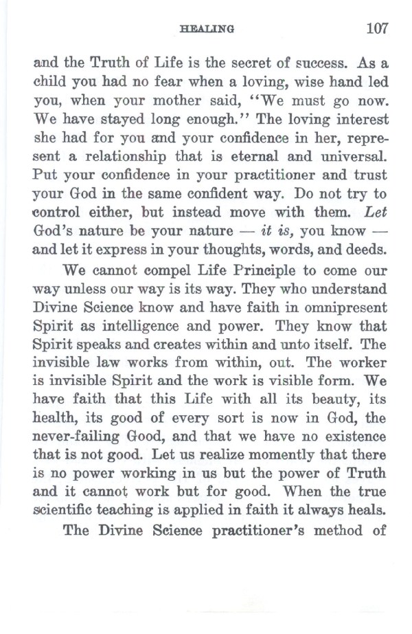 and the Truth of Life is the secret of success. As a child you had no fear when a loving, wise hand led you, when your mother said, "We must go now. We have stayed long enough." The loving interest she had for you and your confidence in her, represent a relationship that is eternal and universal. Put your confidence in your practitioner and trust your God in the same confident way. Do not try to control either, but instead move with them. Let God's nature be your nature -- it is, you know -and let it express in your thoughts, words, and deeds.