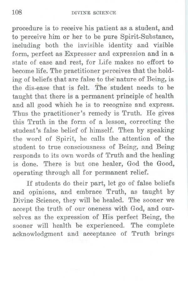 procedure is to receive his patient as a student, and to perceive him or her to be pure Spirit-Substance, including both the invisible identity and visible form, perfect as Expresser and expression and in a state of ease and rest, for Life makes no effort to become life. The practitioner perceives that the holding of beliefs that are false to the nature of Being, is the dis-ease that is felt. The student needs to be taught that there is a permanent principle of health and all good which he is to recognize and express. Thus the practitioner's remedy is Truth. He gives this Truth in the form of a lesson, correcting the student's false belief of himself. Then by speaking the word of Spirit, he calls the attention of the student to true consciousness of Being, and Being responds to its own words of Truth and the healing is done. There is but one healer, God the Good, operating through all for permanent relief.