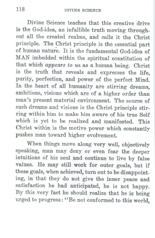 Divine Science teaches that this creative drive is the God-idea, an infallible truth moving throughout all the created realms, and calls it the Christ principle. The Christ principle is the essential part of human nature. It is the fundamental God-idea of MAN imbedded within the spiritual constitution of that which appears to us, as a human being. Christ is the truth that reveals and expresses the life, purity, perfection, and power of the perfect Mind. In the heart of all humanity are stirring dreams, ambitions, visions which are of a higher order than man's present material environment. The source of such dreams and visions is the Christ principle stirring within him to make him aware of his true Self which is yet to be realized and manifested. This Christ within is the motive power which constantly pushes man toward higher evolvement.