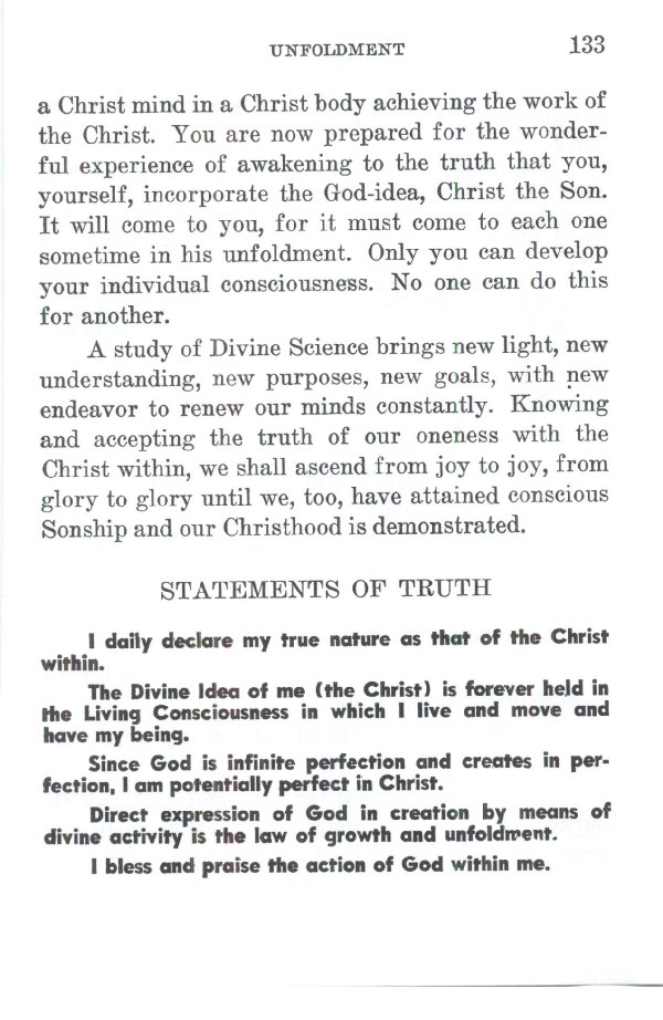 A study of Divine Science brings new light, new understanding, new purposes, new goals, with new endeavor to renew our minds constantly. Knowing and accepting the truth of our oneness with the Christ within, we shall ascend from joy to joy, from glory to glory until we, too, have attained conscious Sonship and our Christhood is demonstrated.