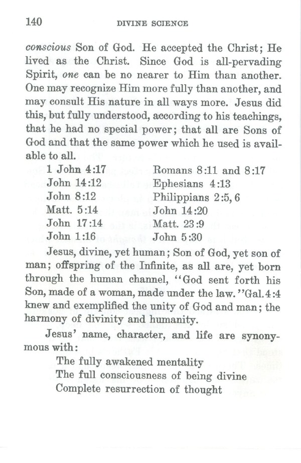 conscious Son of God. He accepted the Christ; He lived as the Christ. Since God is all-pervading Spirit, one can be no nearer to Him than another. One may recognize Him more fully than another, and may consult His nature in all ways more. Jesus did this, but fully understood, according to his teachings, that he had no special power; that all are Sons of God and that the same power which he used is available to all.