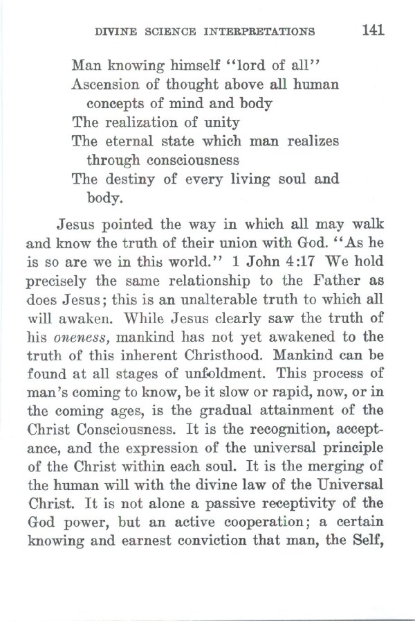 Jesus pointed the way in which all may walk and know the truth of their union with God. "As he is so are we in this world." 1 John 4:17 We hold precisely the same relationship to the Father as does Jesus; this is an unalterable truth to which all will awaken. While Jesus clearly saw the truth of his oneness, mankind has not yet awakened to the truth of this inherent Christhood. Mankind can be found at all stages of unfeldment. This process of man's coming to know, be it slow or rapid, now, or in the coming ages, is the gradual attainment of the Christ Consciousness. It is the recognition, acceptance, and the expression of the universal principle of the Christ within each soul. It is the merging of the human will with the divine law of the Universal Christ. It is not alone a passive receptivity of the God power, but an active cooperation; a certain knowing and earnest conviction that man, the Self,