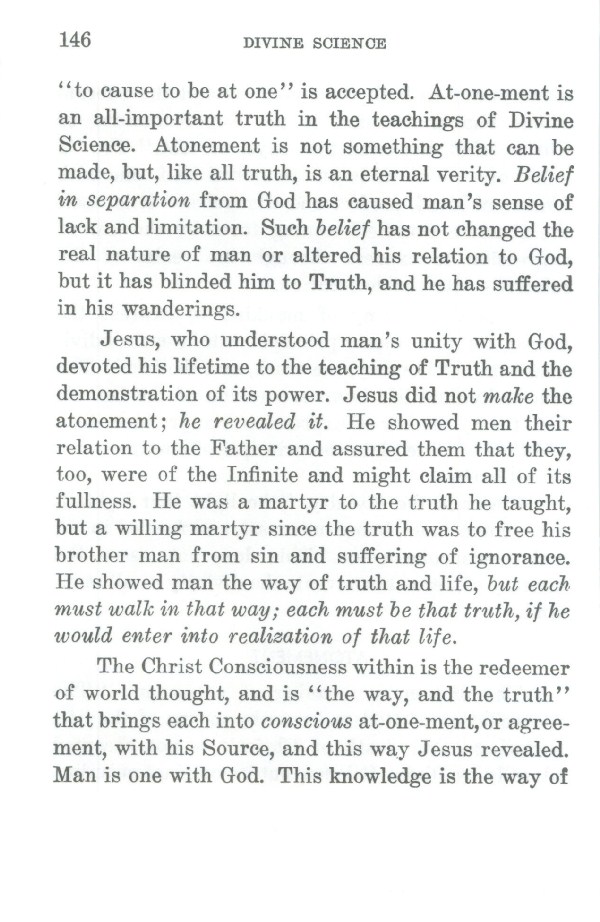 "to cause to be at one" is accepted. At-one-ment is an all-important truth in the teachings of Divine Science. Atonement is not something that can be made, but, like all truth, is an eternal verity. Belief in separation from God has caused man's sense of lack and limitation. Such belief has not changed the real nature of man or altered his relation to God, but it has blinded him to Truth, and he has suffered in his wanderings.