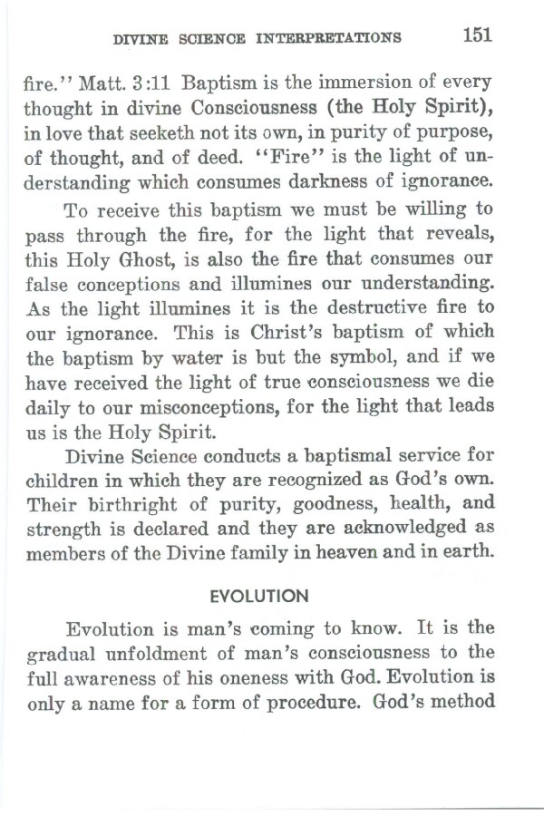 Divine Science conducts a baptismal service for children in which they are recognized as God's own. Their birthright of purity, goodness, health, and strength is declared and they are acknowledged as members of the Divine family in heaven and in earth.