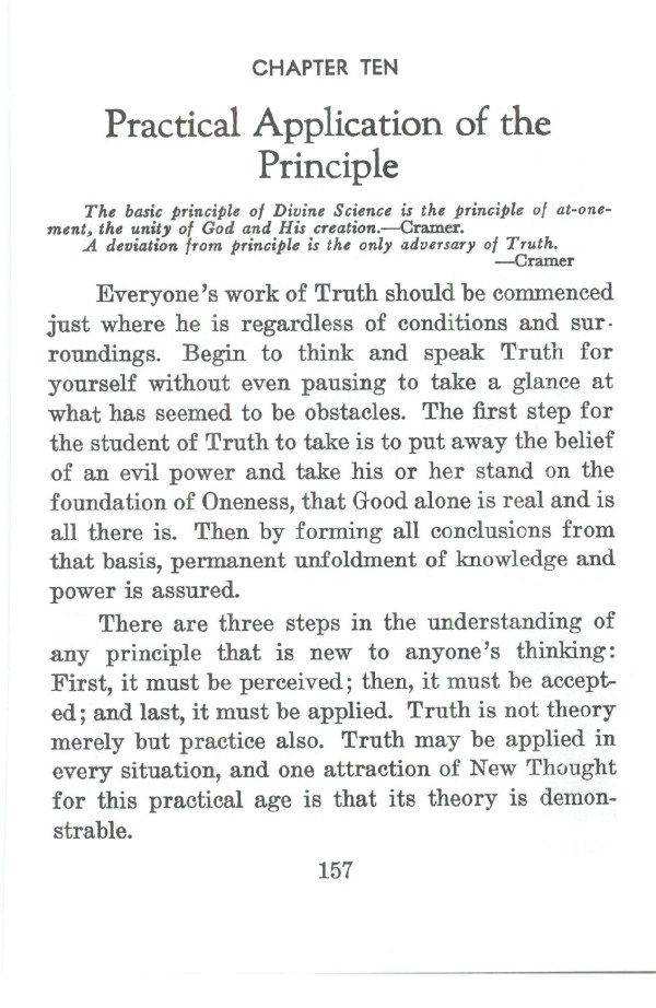 There are three steps in the understanding of any principle that is new to anyone's thinking: First, it must be perceived; then, it must be accepted; and last, it must be applied. Truth is not theory merely but practice also. Truth may be applied in every situation, and one attraction of New Thought for this practical age is that its theory is demonstrable.