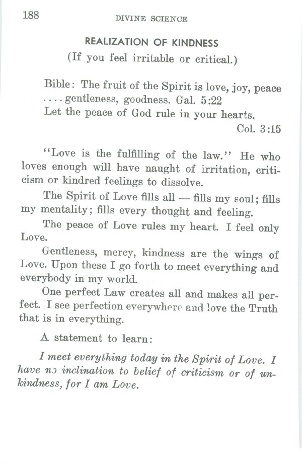 Contents - Foreword - Early History of Divine Science - Revelation - Basis of Divine Science - God and Man are One - Thought - The Work of Thought - Prayer - Healing - Unfoldment - Divine Science Interprets Some Important Doctrines - Practical Application of the Principle - Conclusion - Selected Inspirational Readings - Glossary - Index