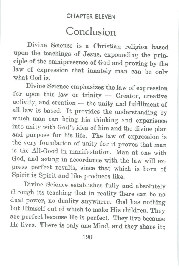 Contents - Foreword - Early History of Divine Science - Revelation - Basis of Divine Science - God and Man are One - Thought - The Work of Thought - Prayer - Healing - Unfoldment - Divine Science Interprets Some Important Doctrines - Practical Application of the Principle - Conclusion - Selected Inspirational Readings - Glossary - Index