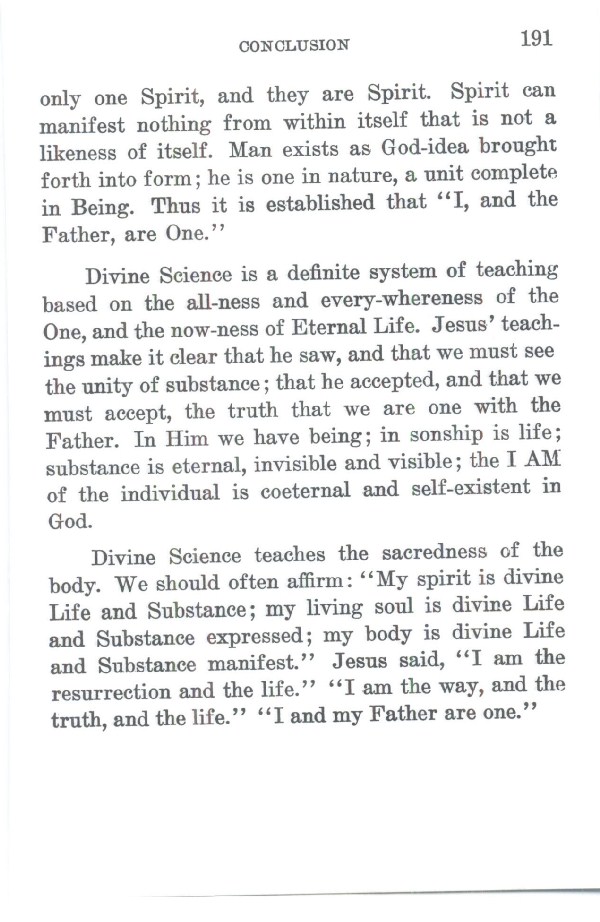 Divine Science teaches the sacredness of the body. We should often affirm. "My spirit is divine Life and Substance; my living soul is divine Life and Substance expressed; my body is divine Life and Substance manifest." Jesus said, "I am the resurrection and the life." "I am the way, and the truth, and the life." "I and my Father are one."