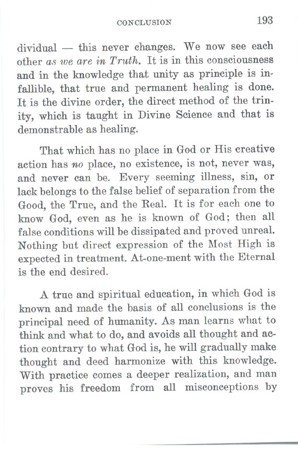 -- this never changes. We now see each other as we are in Truth. It is in this consciousness and in the knowledge that unity as principle is infallible, that true and permanent healing is done. It is the divine order, the direct method of the trinity, which is taught in Divine Science and that is demonstrable as healing.